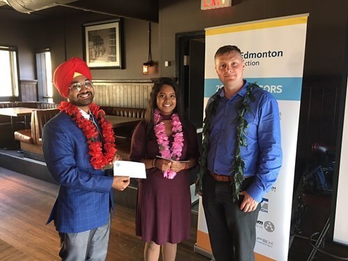 Conor Heeney presents cheques to Nirwair Singh Bajwa (U of A, left) & Shreya Nandiraju (NAIT,centre), recipients of the J.R. (Bob) Connell Scholarship.